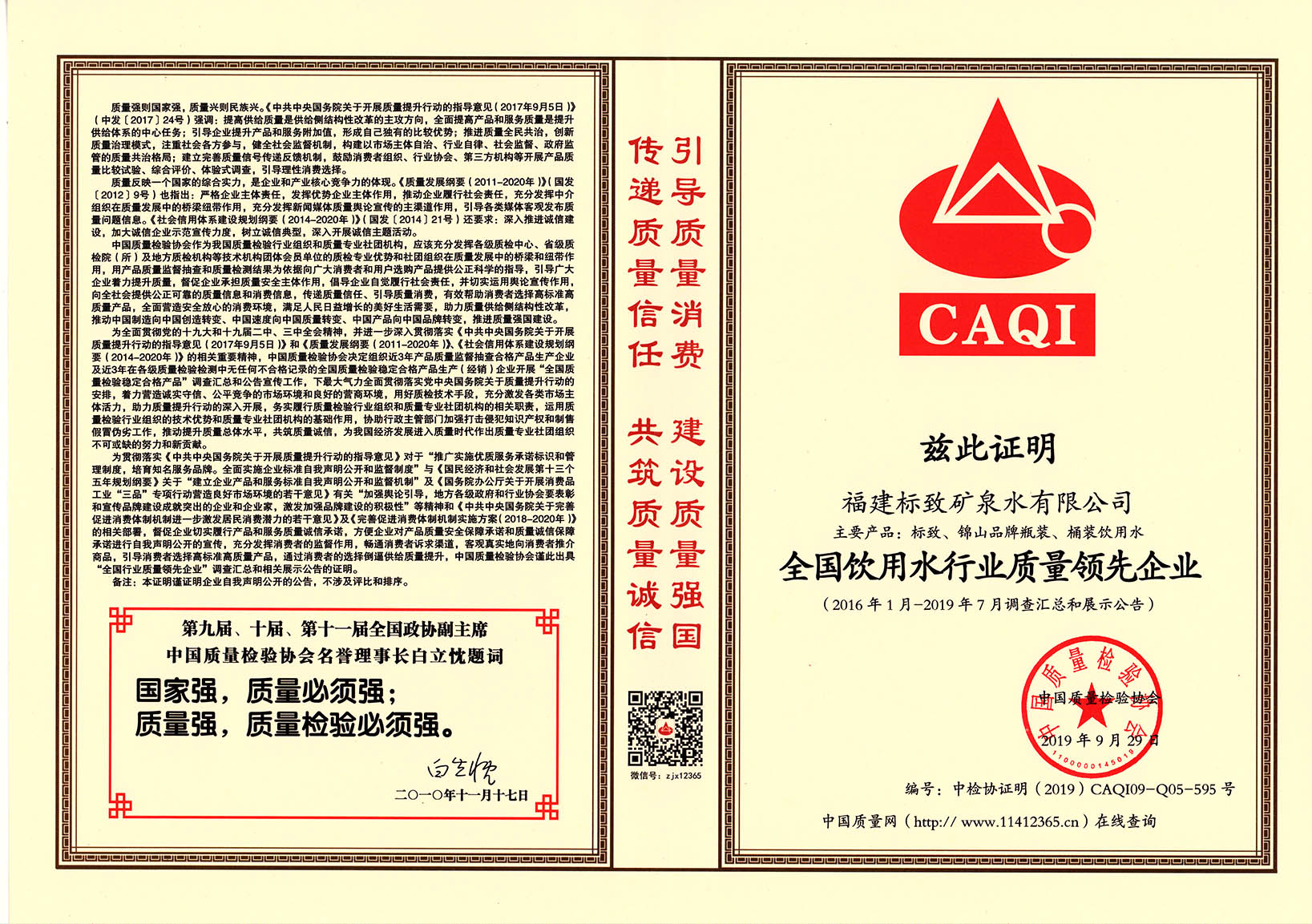 • 2020-03-252019年9月,標致公司榮獲“全國飲用水行業質量領先品牌”稱號